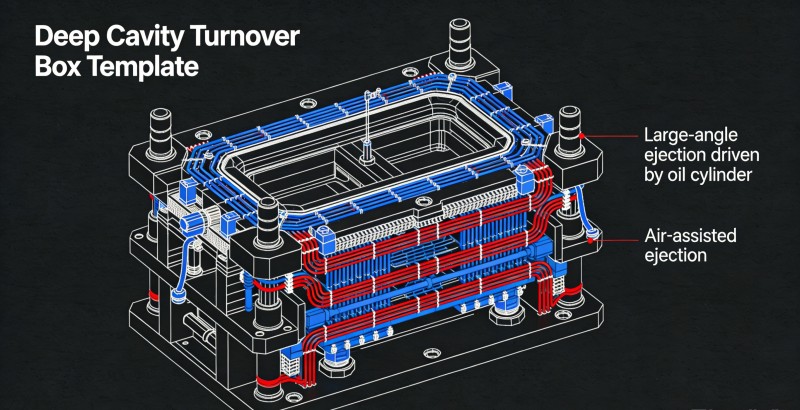 Cabaran: Isipadu besar dan dinding bekas logistik yang tebal mengakibatkan masa penyejukan yang berpanjangan, mengehadkan kapasiti pengeluaran. Penyelesaian: Reka bentuk saluran penyejukan berkelajuan tinggi bersiri berbilang lapisan dengan padat meliputi semua kawasan berdinding tebal. Untuk bekas rongga dalam, gabungkan "ejektor condong sudut besar dipacu silinder hidraulik" dengan "pelemparan berbantukan gas" untuk memastikan pembongkaran yang lancar dan pantas dalam masa yang minimum tanpa ubah bentuk atau lekatan vakum, meminimumkan kitaran pengeluaran.