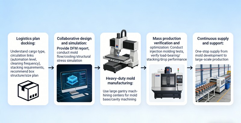 1. Penjajaran Penyelesaian Logistik: Fahami jenis kargo anda, peringkat pengendalian (cth., tahap automasi, kekerapan pembersihan) dan keperluan tindanan untuk mengesyorkan struktur kontena yang optimum dan penyelesaian saiz. 2. Reka Bentuk & Simulasi Kolaboratif: Menyediakan laporan DFM yang komprehensif dan menjalankan aliran acuan, penyejukan dan simulasi tekanan struktur untuk memastikan penyelesaian acuan optimum dalam prestasi dan kos. 3. Pembuatan Acuan Tugas Berat: Gunakan pusat pemesinan gantri yang besar untuk menjamin ketepatan dan ketegaran dalam pemesinan tapak dan rongga acuan besar. 4. Pengesahan & Pengoptimuman Pengeluaran Beramai-ramai: Menjalankan ujian pengeluaran berterusan pada mesin pengacuan suntikan untuk mengesahkan metrik prestasi kritikal (ujian menanggung beban, menyusun, menjatuhkan) dan memuktamadkan proses. 5. Bekalan & Sokongan Berterusan: Kami menawarkan bekalan sehenti daripada pembangunan acuan kepada pengeluaran acuan suntikan berskala besar, memastikan kualiti produk yang konsisten dan penghantaran tepat pada masanya.