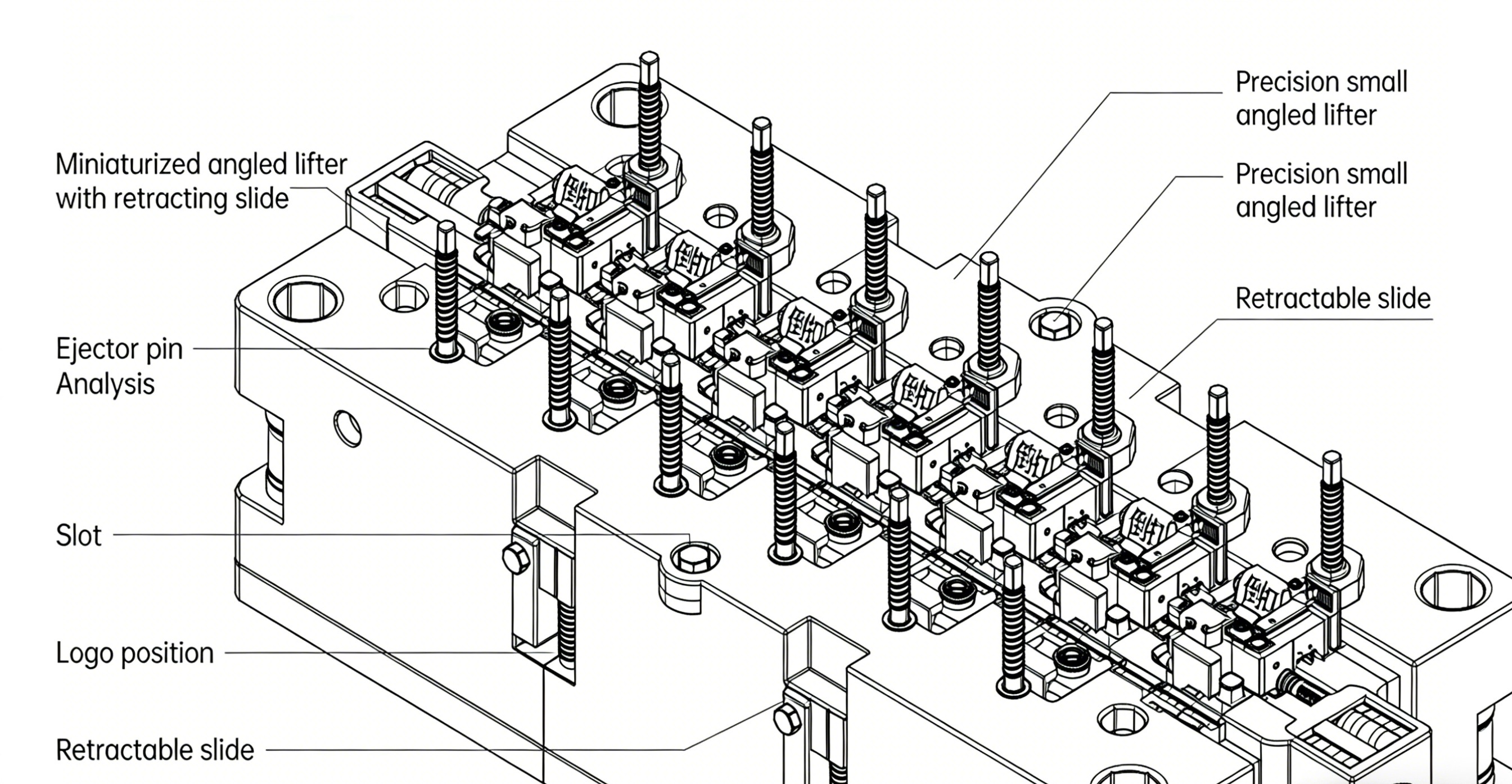 Cabaran: Bahagian dalamannya menampilkan selak petak bateri yang padat, pin kedudukan PCB dan mekanisme slot hiasan, mewujudkan struktur kompleks yang terdedah kepada tanda kilat, ubah bentuk atau calar semasa merobohkan. Penyelesaian: Reka bentuk mekanisme gabungan "pelanut tirus mikro berbilang kumpulan dan penggelongsor boleh tarik". Ejector tirus mikro ketepatan padat menangani potongan dan tulang rusuk dalaman yang padat. Untuk slot sisi atau kedudukan logo, slaid yang boleh ditarik balik memastikan pelepasan lancar tanpa kerosakan produk. Susun atur pin ejector menjalani analisis tegasan untuk menjamin pancaran yang lancar dan seimbang.